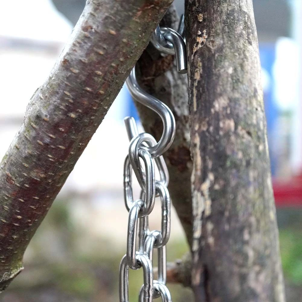Unsere Dreibein-Halterung ist super einfach aufzubauen, platzsparend und praktisch für das Kochen im Freien. Dank dieser Halterung müssen Sie kein schweres Campingstativ mehr tragen. Verwenden Sie einfach die 3-Loch-Edelstahlplatte und fügen Sie drei Stöcke oder Stangen hinzu, um Ihr eigenes, stabiles Dreibein-Grillstativ zu erschaffen. Töpfe, Kessel oder Teekannen können einfach in der gewünschten Höhe an der Kette, über das Feuer gehängt werden. Holzstöcke sind im Lieferumfang nicht enthalten.