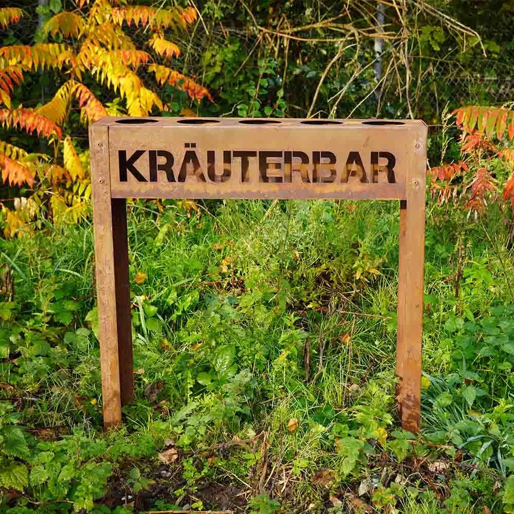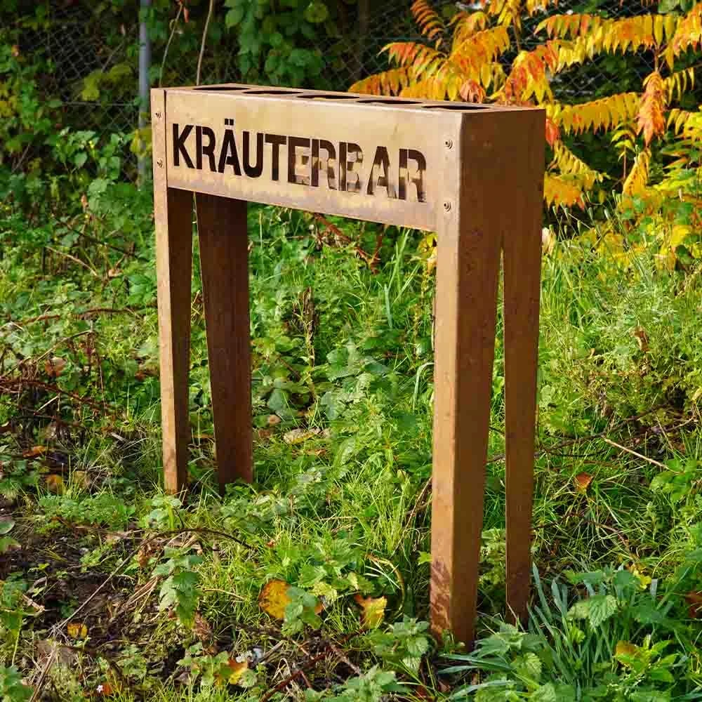 Mit unserer Kräuterbar in Rostoptik können Sie alle Arten von Blumen, Pflanzen und Kräuter eindrucksvoll in Szene setzten. Dessen Edelrostpatina ist nicht nur hübsch anzusehen, sondern ist zudem eine natürliche Schneckenbarriere! Die Aussparungen mit einem Durchmesser von Ø 12 cm sind ideal um handelsübliche Kräutertöpfe darin einzusetzen. Unsere langlebige und pflegeleichte Edelrost Kräuterbar ist ein Highlight für Garten oder Terrasse.