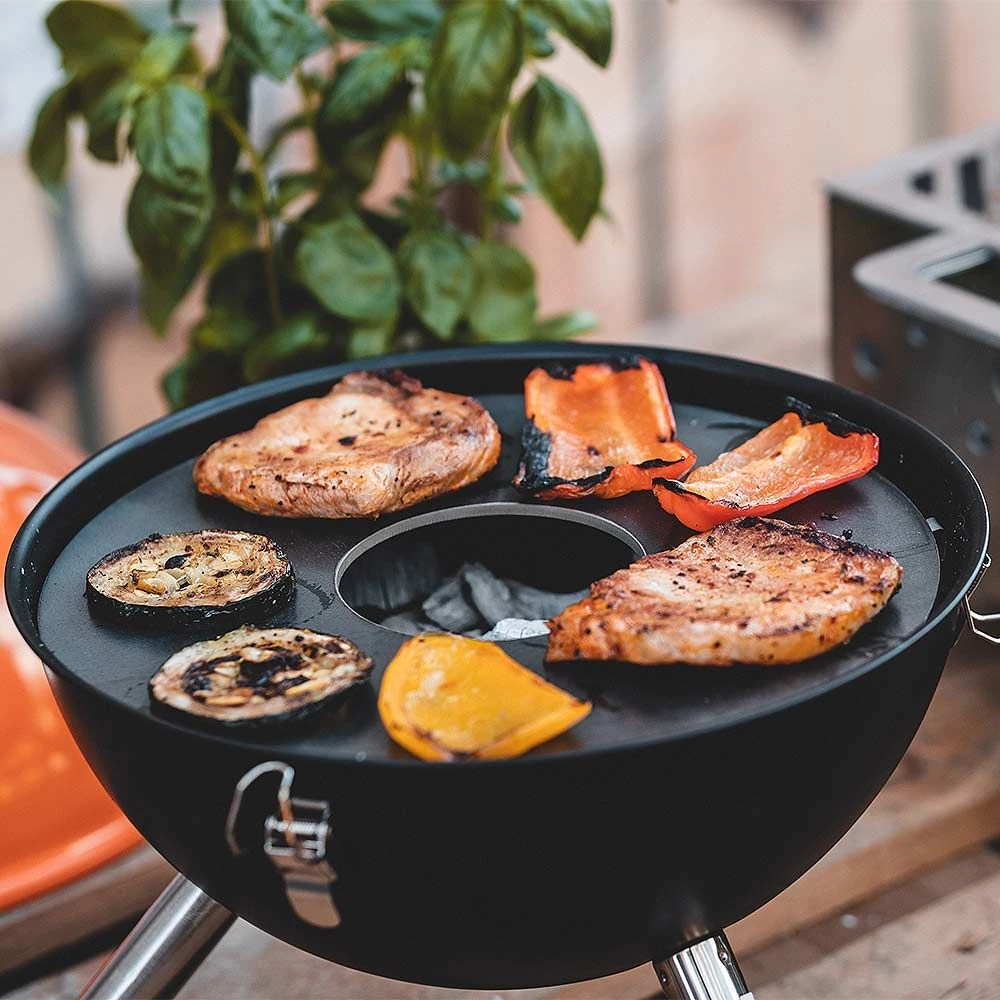 Machen Sie Grillen zu Ihrem BBQ und mit der Feuerplatte zum Highlight für daheim. Die runden Feuerplatten lassen sich einfach im Kugelgrill auf die bestehenden Auflagen platzieren und Sie können nach Herzenslust tolle Speisen darauf zubereiten. Der Vorteil zum Grillrost ist, dass das Fett und Flüssigkeiten nicht ins Feuer tropfen, sich entzündet oder Fleisch und Grillgut schwarz werden lässt.