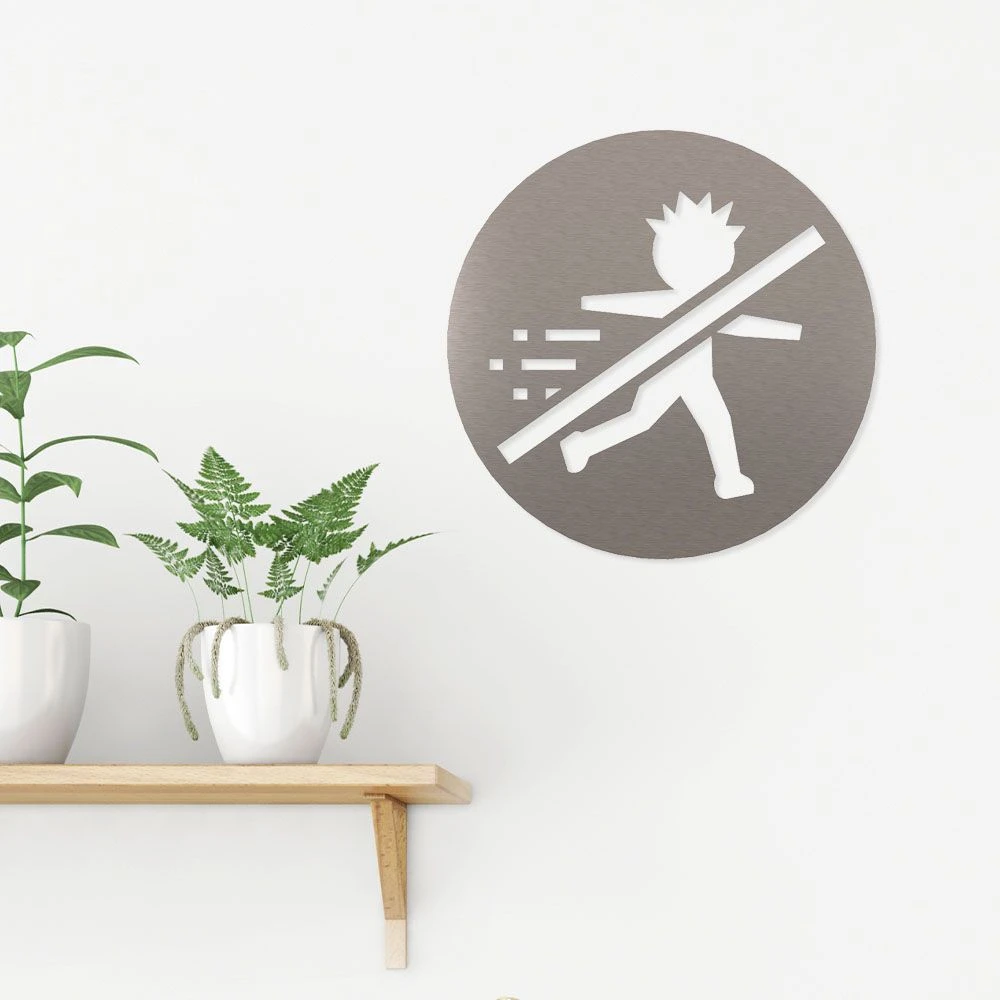 Mit dem Piktogramm „Rennen verboten“ erhalten Sie ein elegantes Schild für die einfache Anbringung an Türen und Wänden, z. B. zur Kennzeichnung von Sanitärräumen im Büro, in Geschäften, in Hotels oder in öffentlichen Gebäuden. Unsere Piktogramme werden in Handarbeit aus hochwertigem Edelstahl gefertigt und sind langlebig und robust.