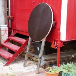 Unser handgefertigter Stehtisch ist, dank der abklappbaren Tischplatte aus Holz, kinderleicht aufgebaut.